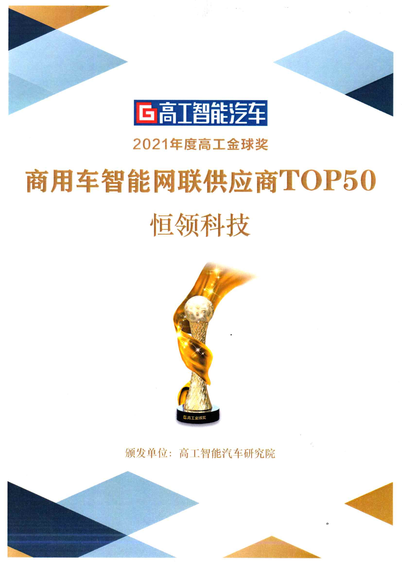 第五屆高工智能汽車年會暨金球獎年度評選榮獲“2021年度高工金球獎-商用車智能網聯供應商TOP50“獎項